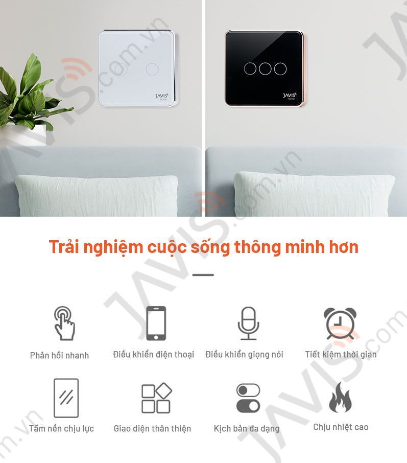 - Kết nối điều khiển bật tắt, hẹn giờ, kịch bản, tự động hóa từ xa qua điện thoại, hỗ trợ điều khiển giọng nói tiếng Việt qua App iOS, Android hoặc loa JAVIS. Tiếng Anh qua Apple Siri, Google Assistant, loa Google Home, alexa .